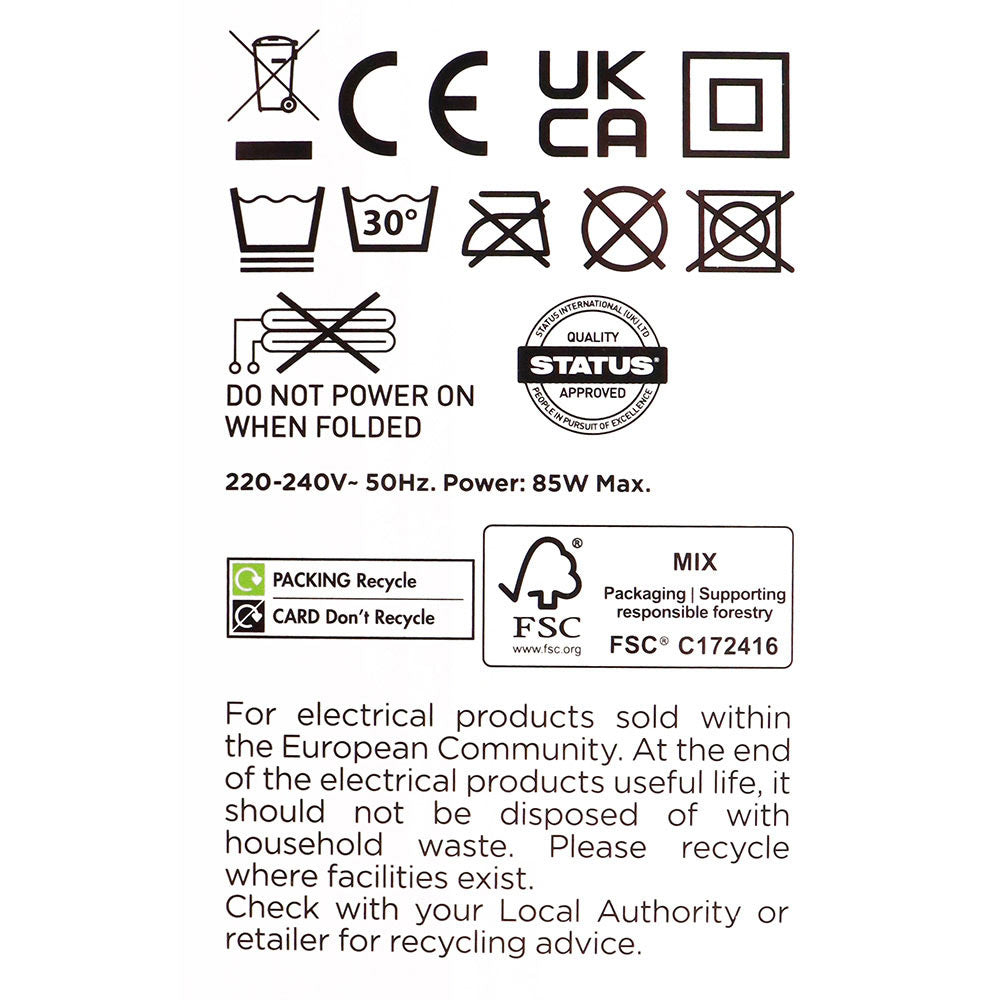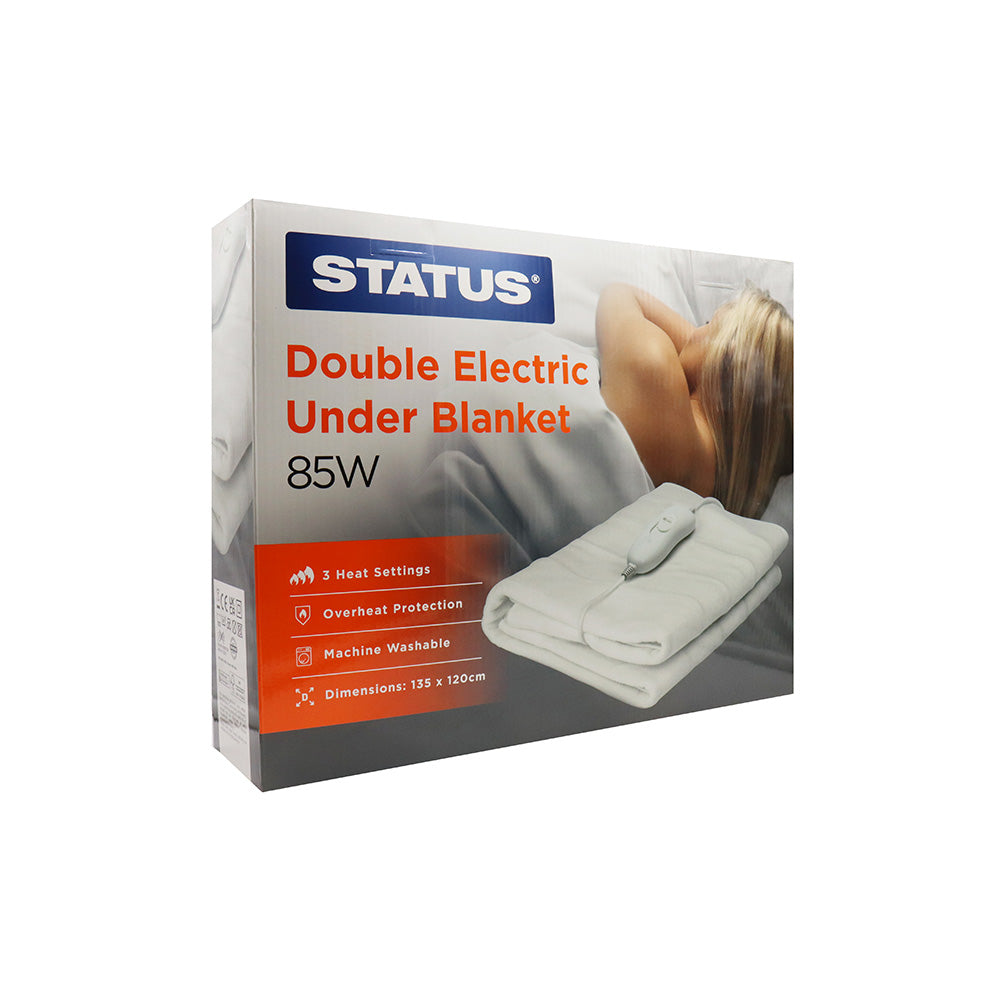 Status 85W double heated under blanket made from white polyester. This blanket is machine washable. Suitable for overheat safety protection. It comes with three heat settings high/medium/low/off. Power indicator light. Also suitable for all night use on low heat. Pre-heat facility. Tie down cords for easy attachment to bed. Machine washable at 40 degrees (control cable must be detached before washing).