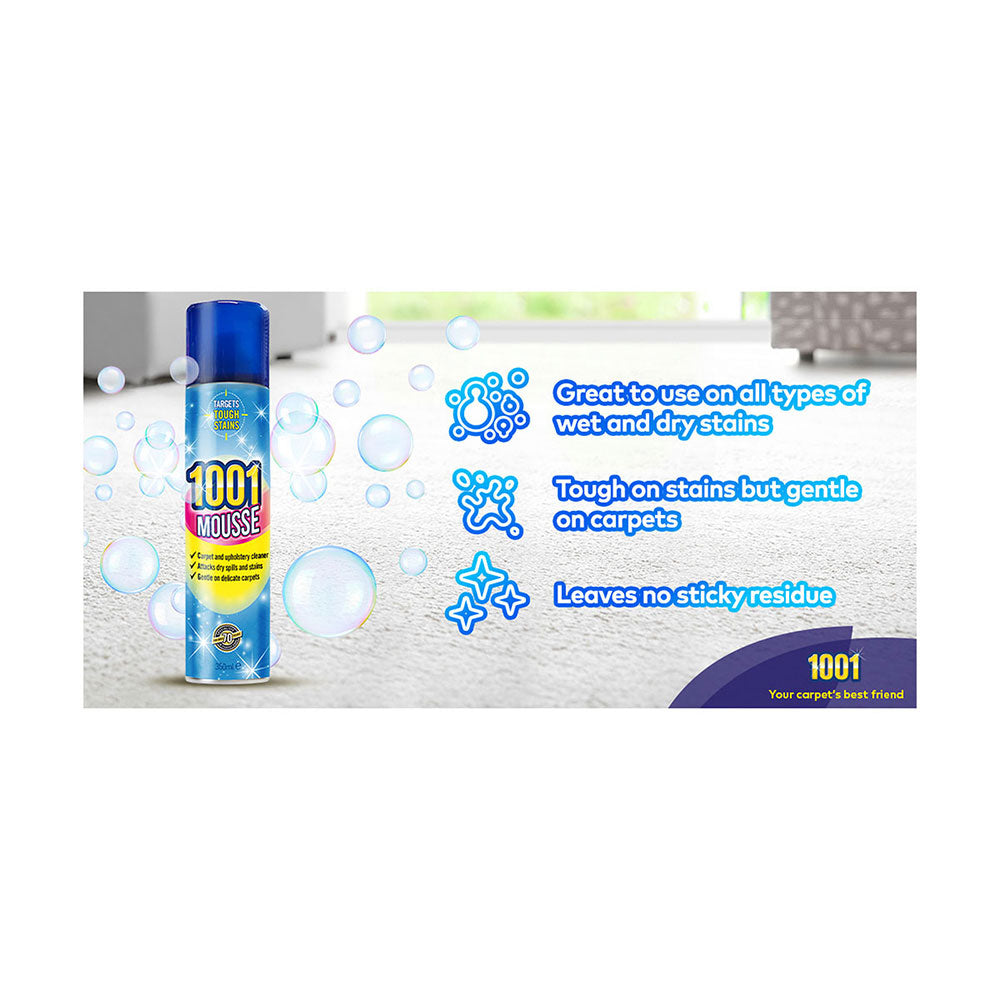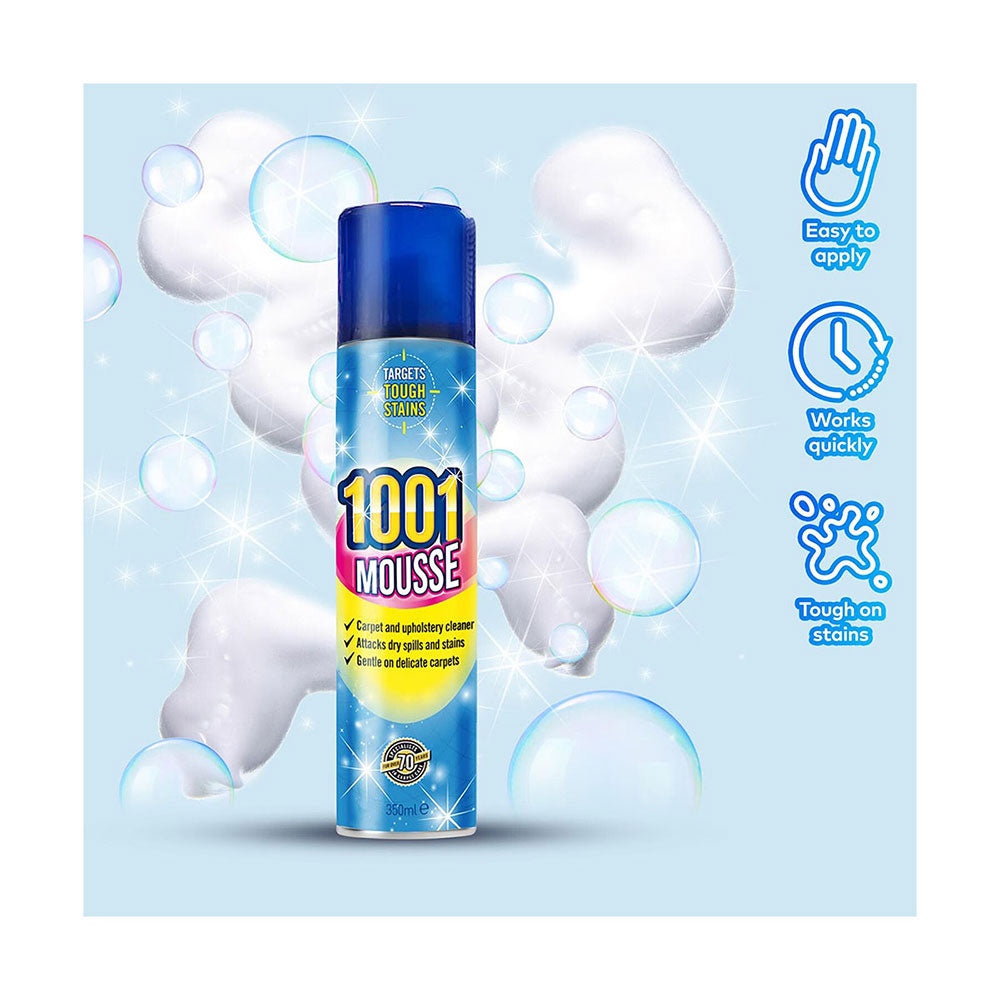 1001 Mousse has a unique rapid-drying formula that works its magic deep-down into fibres to remove stains quickly. Designed to effectively tackle ground-in dirt as well as all types of dry spills and stains, 1001 Mousse will deal with red wine, tea, mud, coffee and juice stains and much more. Features: