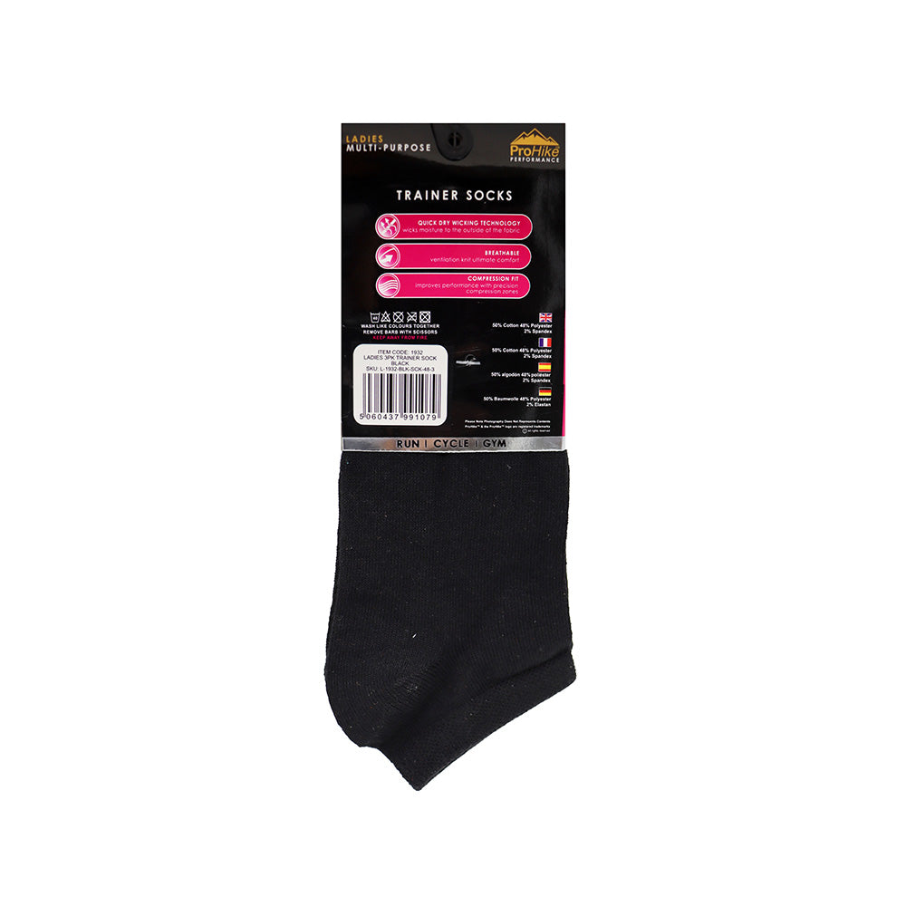 Stay comfortable and stylish with the Ladies Black Trainer Socks 3PK Size 4¨C8. Designed for a discreet, no-show fit inside trainers and casual shoes, these socks are ideal for active lifestyles and everyday wear. Made from a soft, breathable cotton blend with reinforced heels and toes, they offer lasting comfort and durability. The convenient 3-pack ensures you always have a fresh pair ready - making them a wardrobe essential for any woman on the go.