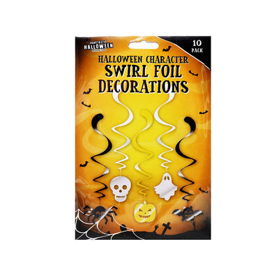 A black cobweb-patterned plastic bucket with orange accents, designed for Halloween decoration, displayed on a purple background with a white plate and spider figurines around it.