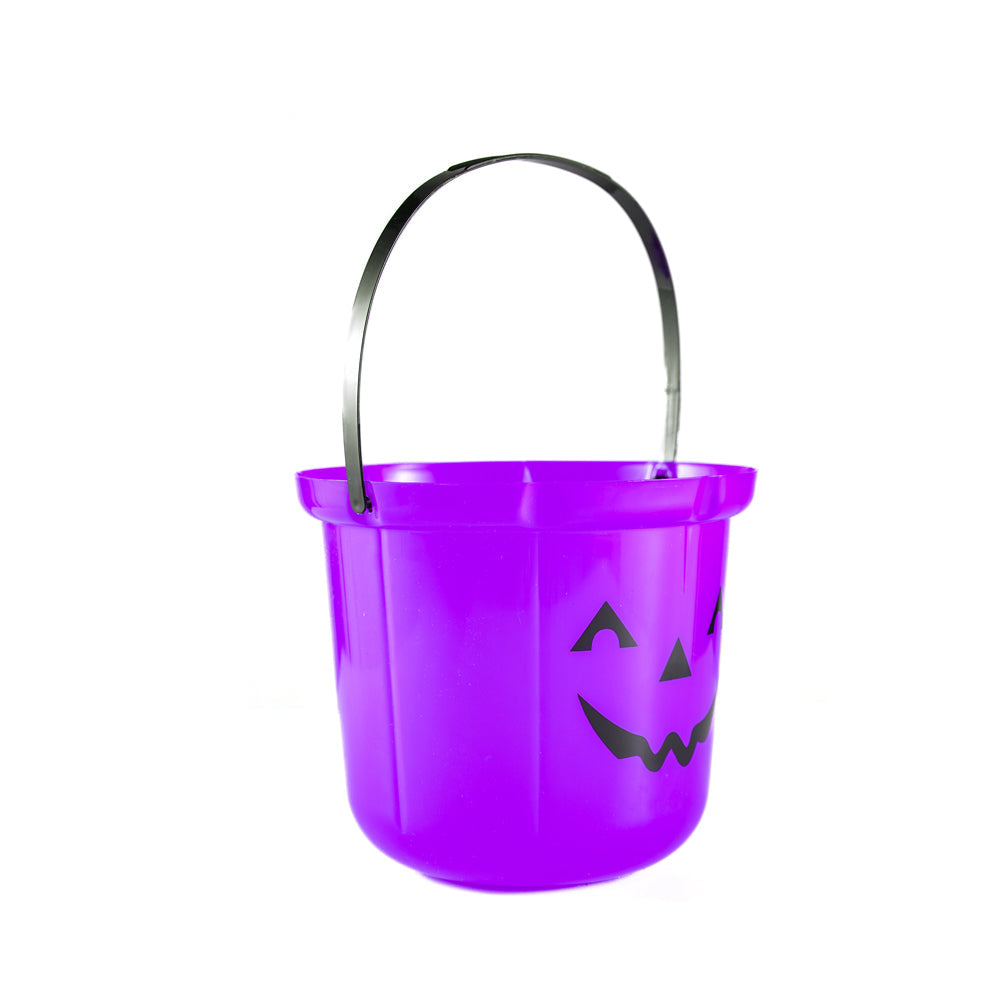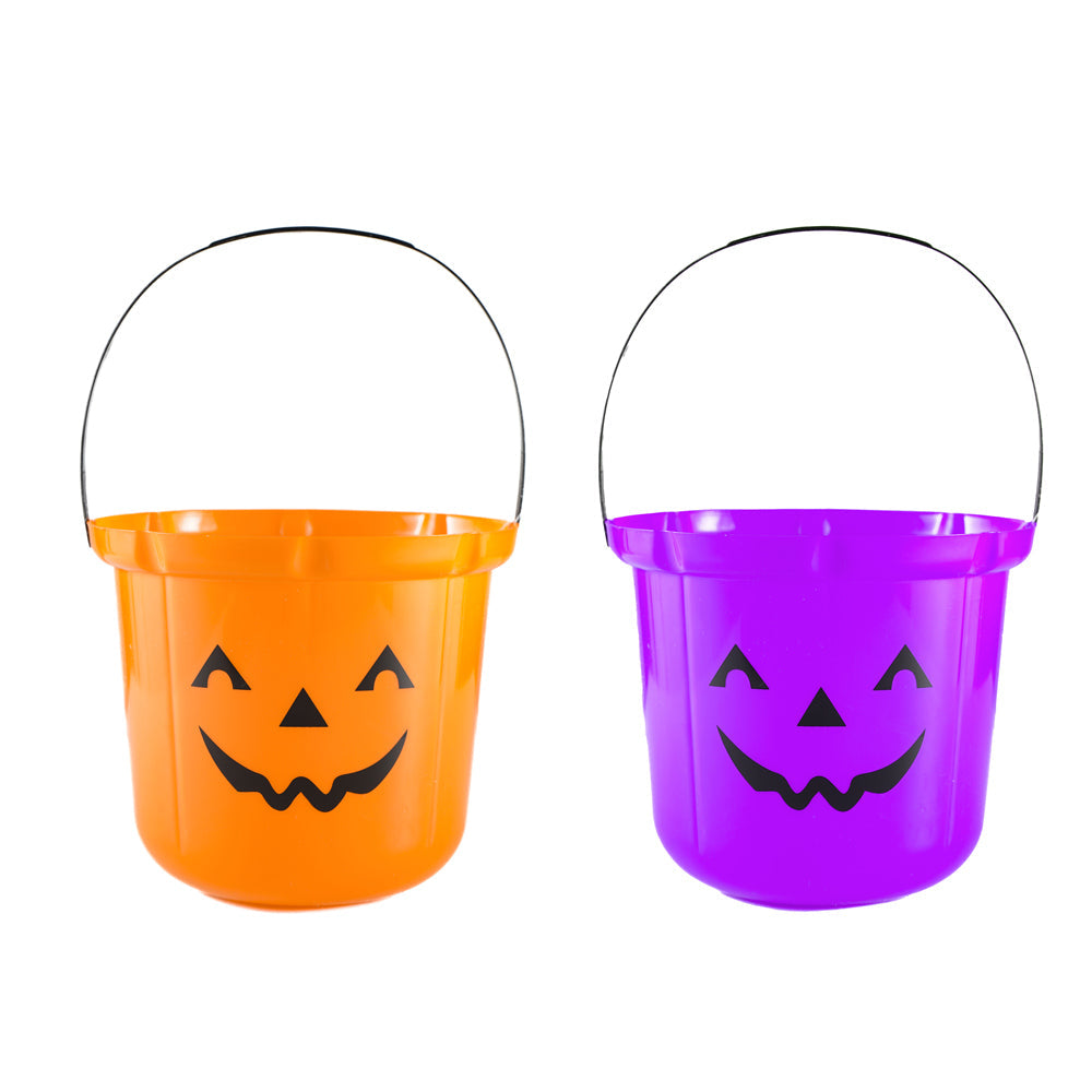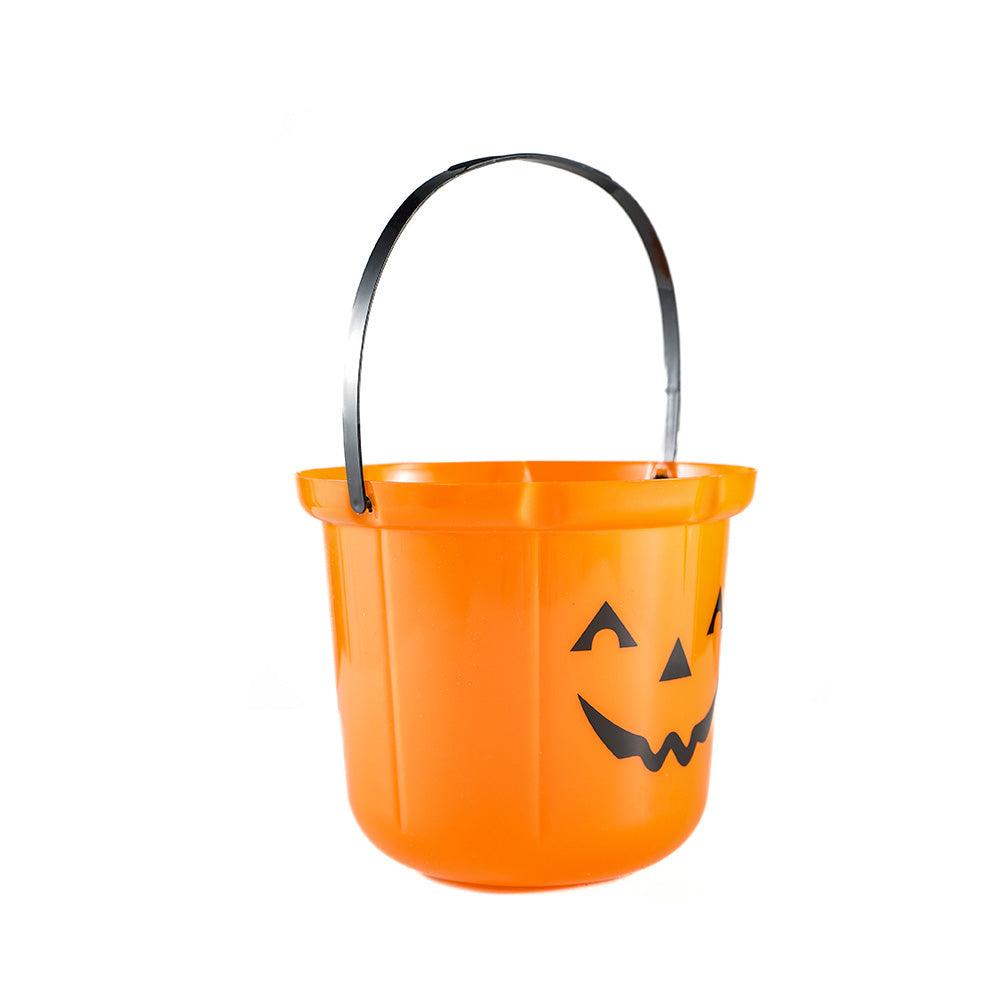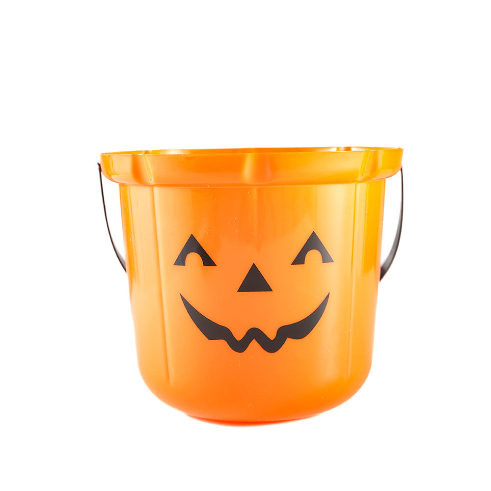 This plastic Halloween bucket features a grinning pumpkin pattern set against a bright orange backdrop for a spooky twist, and the smooth black handle lends a bit of appealing contrast while providing a convenient carrying option.