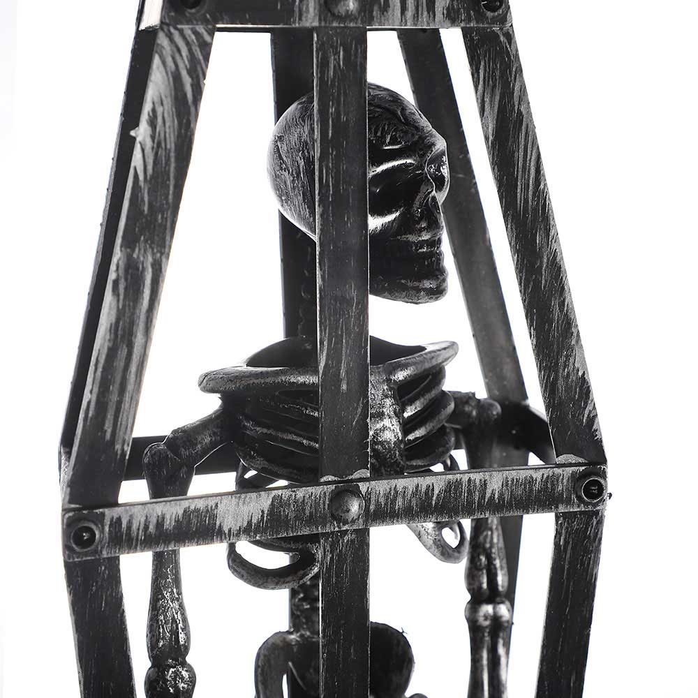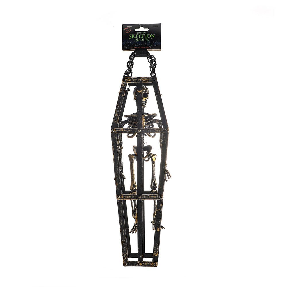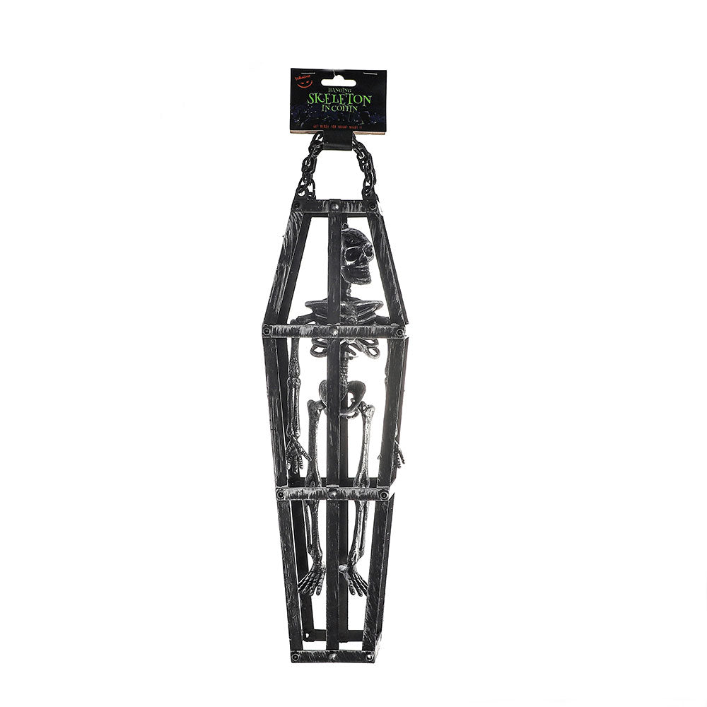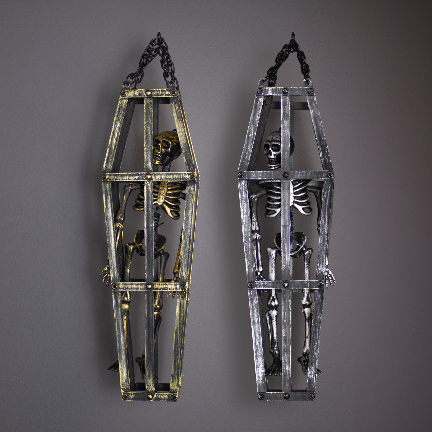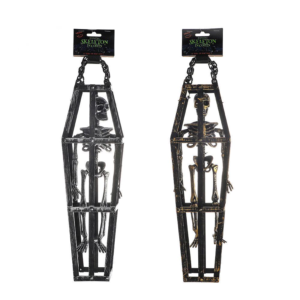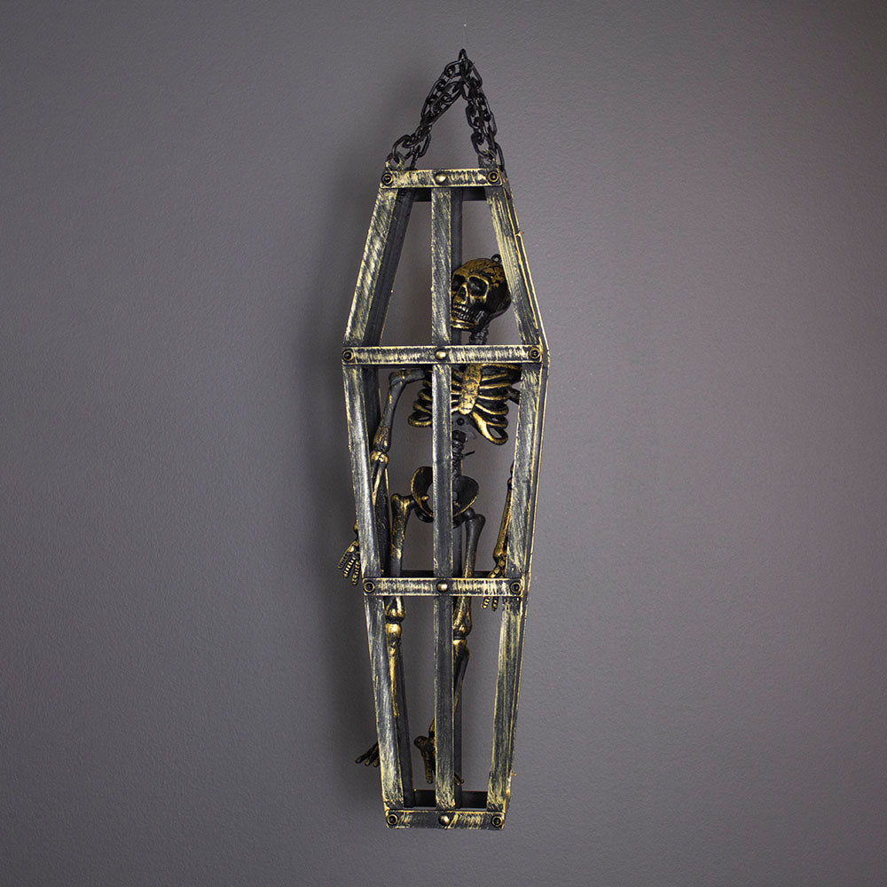 Be the spookiest house in town with this hanging skeleton Halloween decoration. Designed with a silver and gold cage with a hanging chain attached and a creepy skeleton figure in the middle, this Halloween decoration will be sure to creep out all your Halloween party guests! Features: