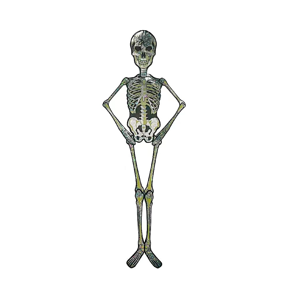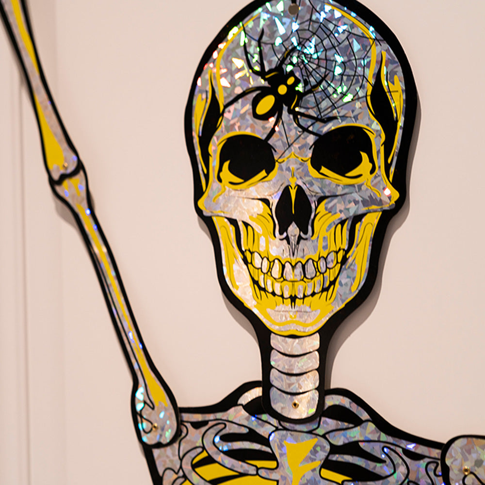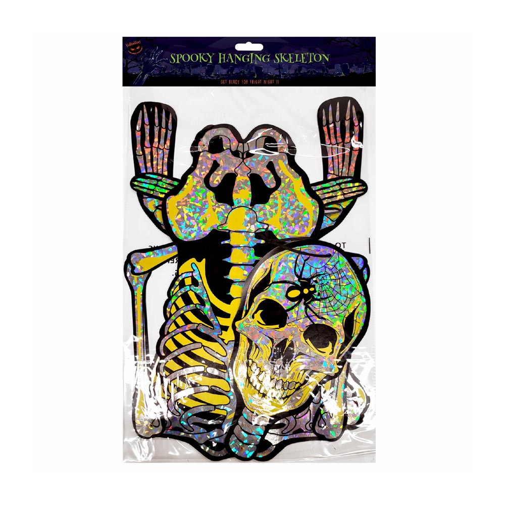 Stand out this Halloween with this holographic hanging skeleton decoration. featuring a holographic and bright yellow print all over, this Halloween decoration would be perfect for hanging up in doorways and around the home. Complete with a hanging ribbon, this skeleton decoration will be easy to add to your Halloween display! Features: