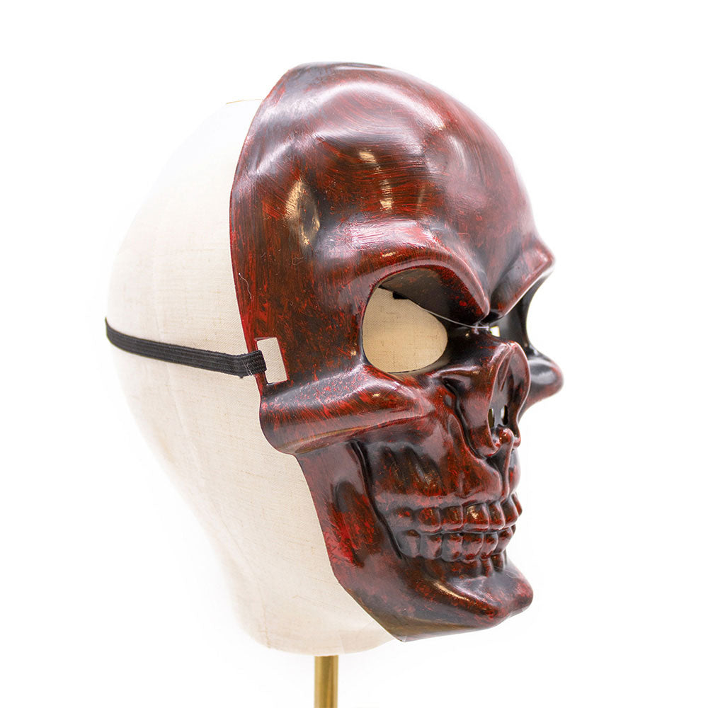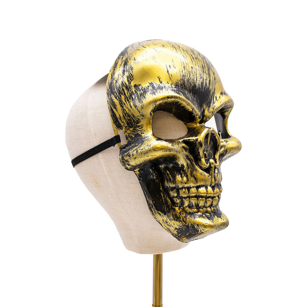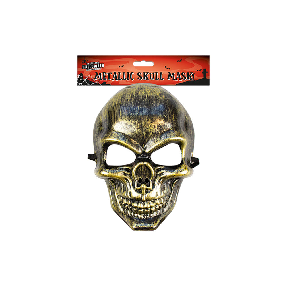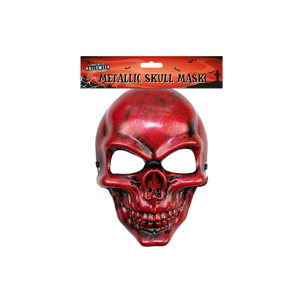 This Metallic Skull Mask comprises a durable 16.5cm x 24cm plastic mask with an attached elasticated string. The menacing skull design has cut out eye and nostril features and is complete with a metallic red or gold finish. Perfect for Halloween parties or trick or treating. Feature:
