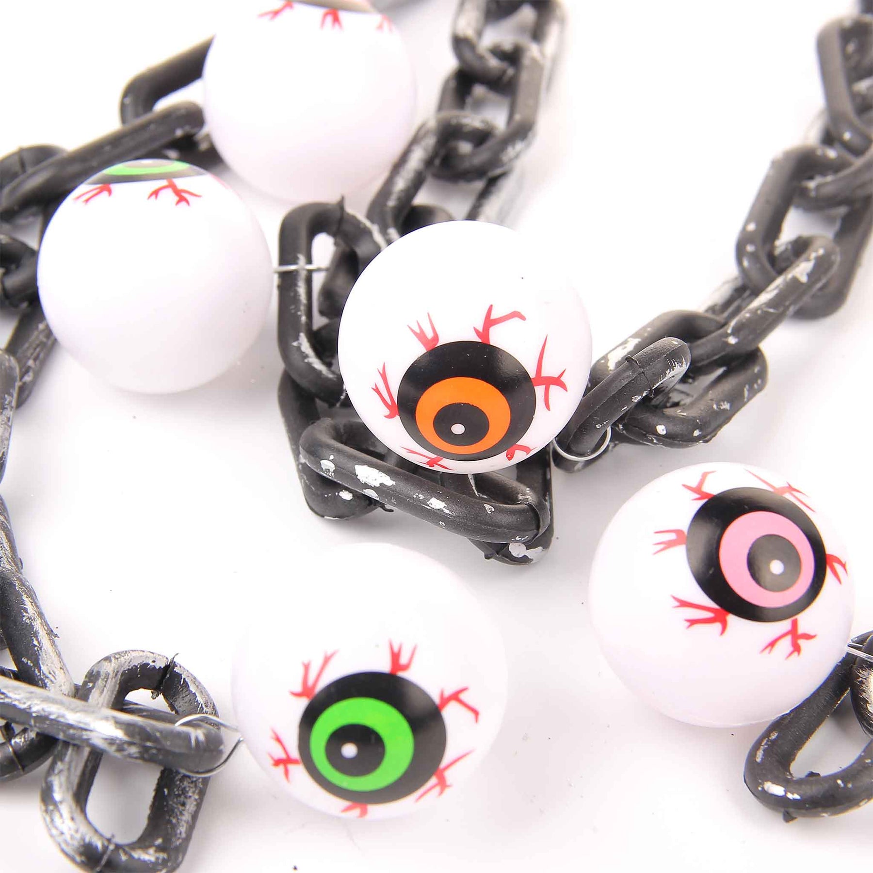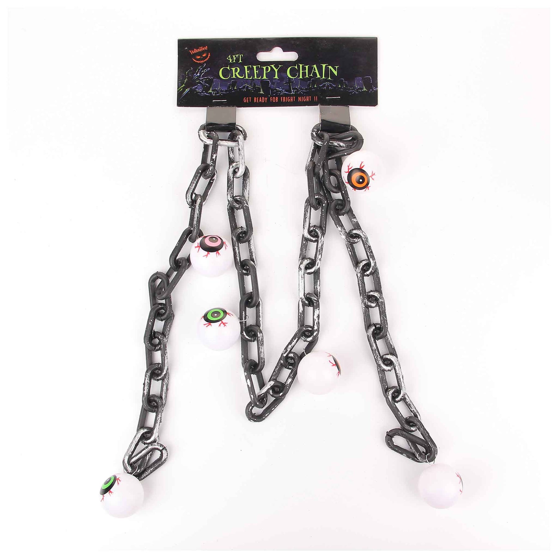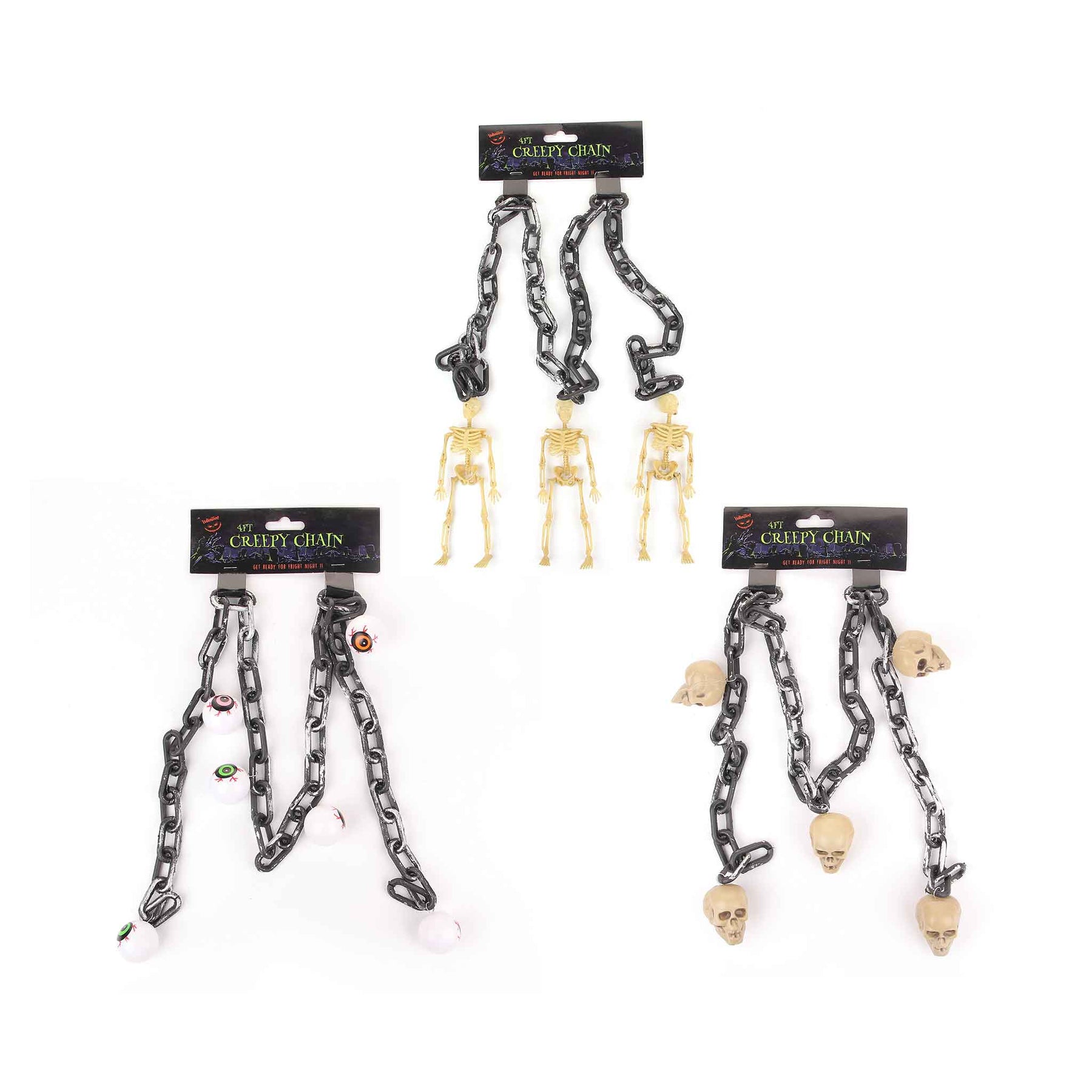 It's time to get creepy with this super creepy chain Halloween decoration. Featuring a black and silver chain with bloodshot eyeballs or skull or Skeleton attached this decoration can be hung up or displayed around the home for a spook-tastic finishing touch to your Halloween decor! Features: