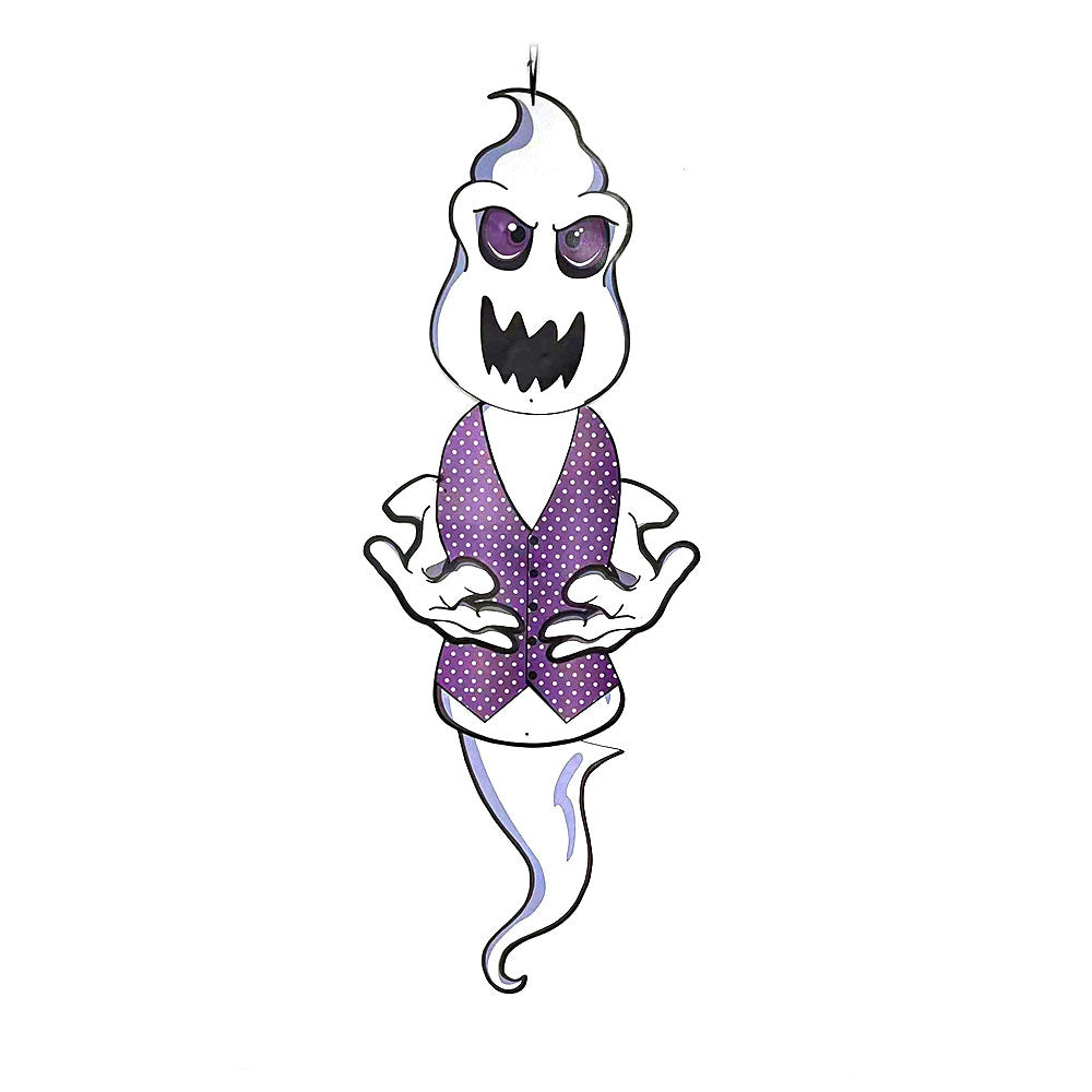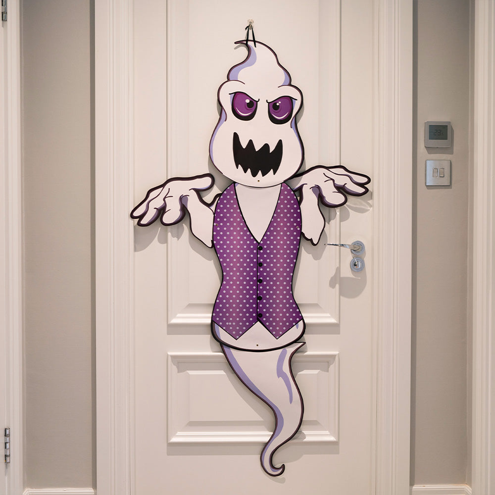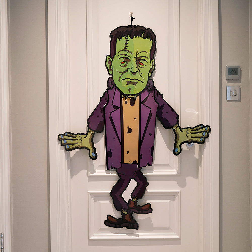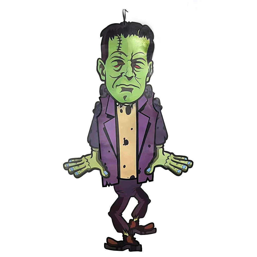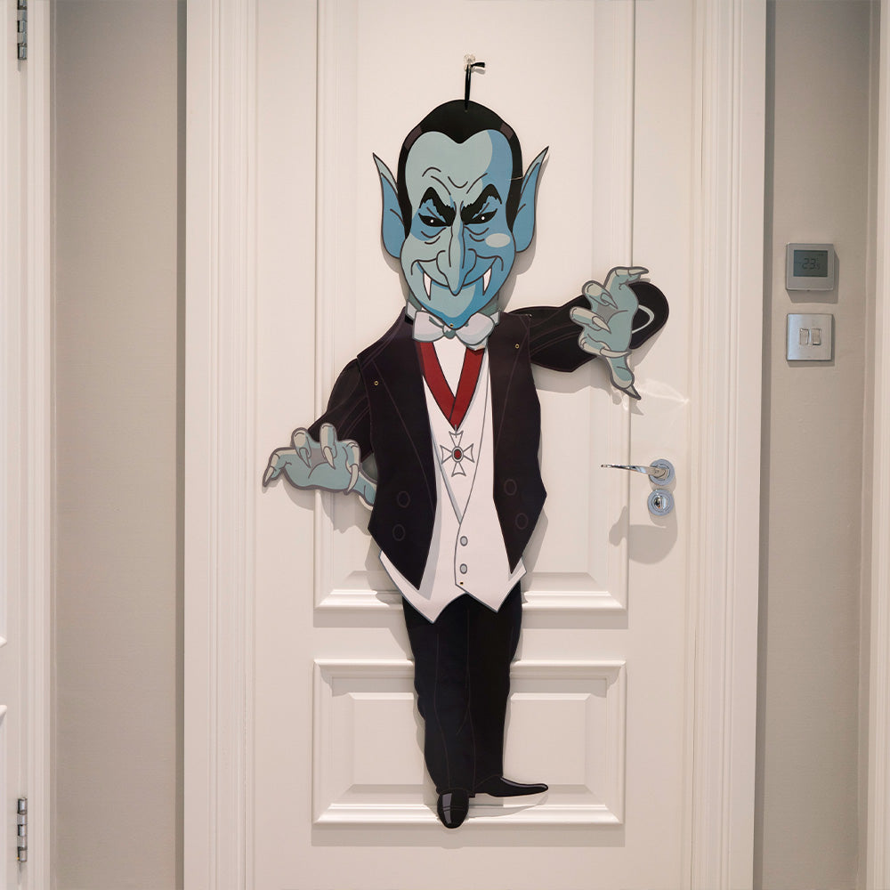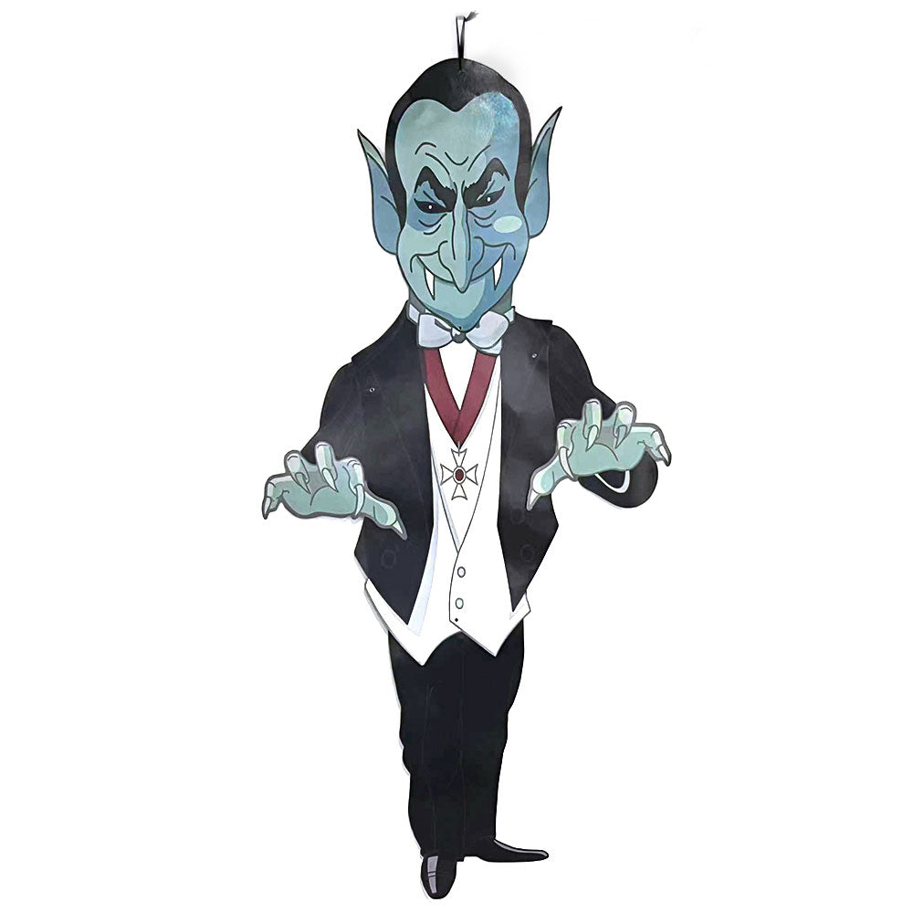 Choose between four spooky characters of a: Wicked Witch, Frankenstein, Count Dracula, and a White Ghoulish Ghost to hang around your home. With a simple black loop tie, these light-weight cardboard designs will easily make any room fit for a Halloween party!