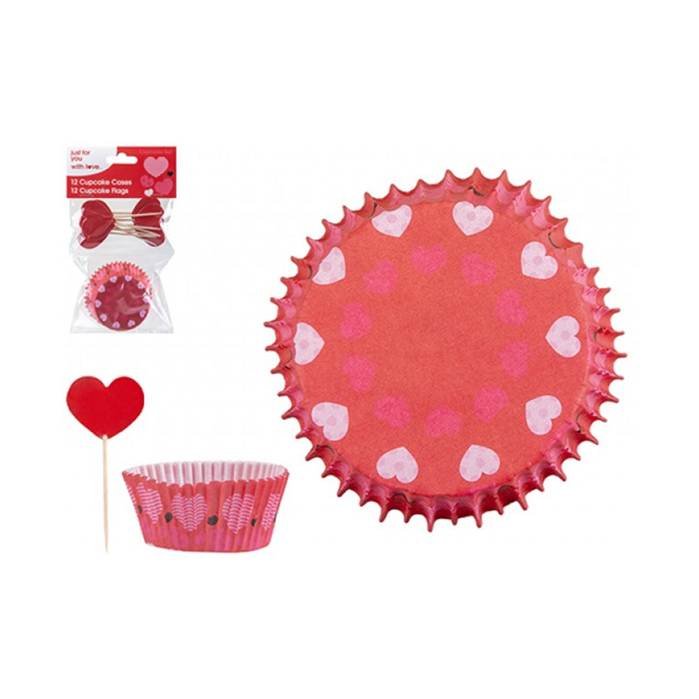 This love heart cupcake kit is a simple way to make homemade bakes feel extra special. The red cupcake cases are printed with sweet heart details, while the matching heart-shaped picks add a playful finishing touch.