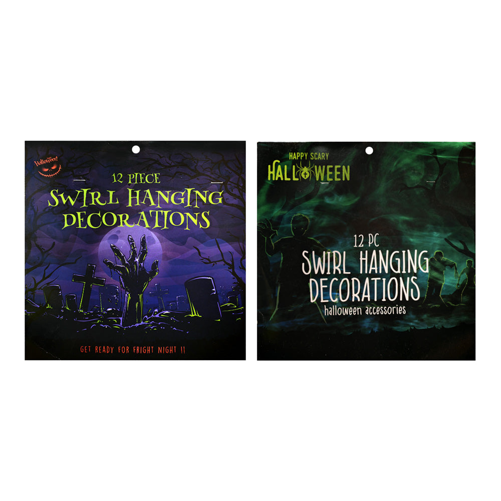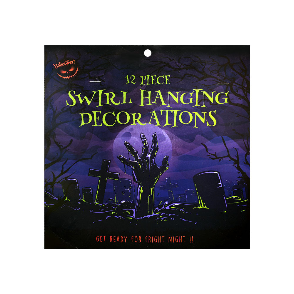 Transform your home into a haunted house this Halloween with this set of 12 swirling hanging decorations. Designed in assorted spooky styles, these lightweight and eye-catching swirls are perfect for hanging from ceilings, doorways, or party tables to create a chilling atmosphere.