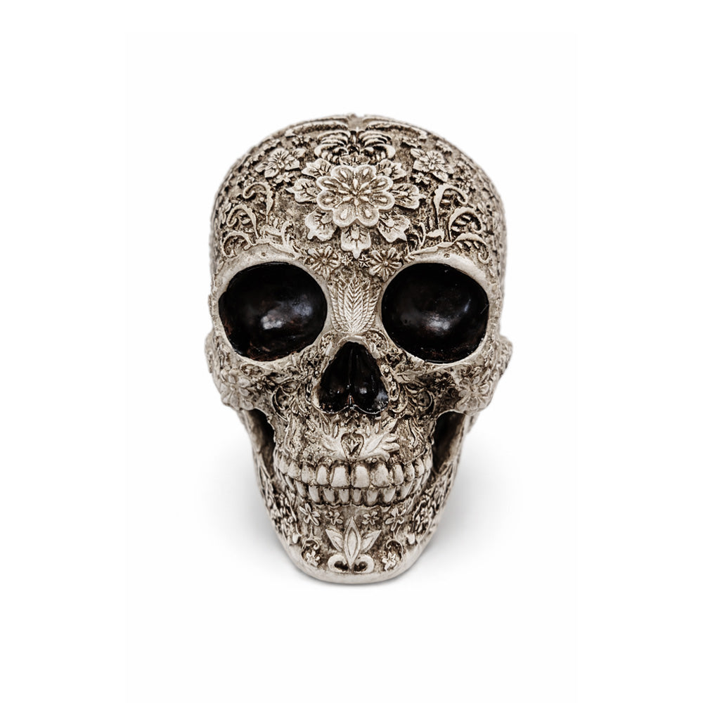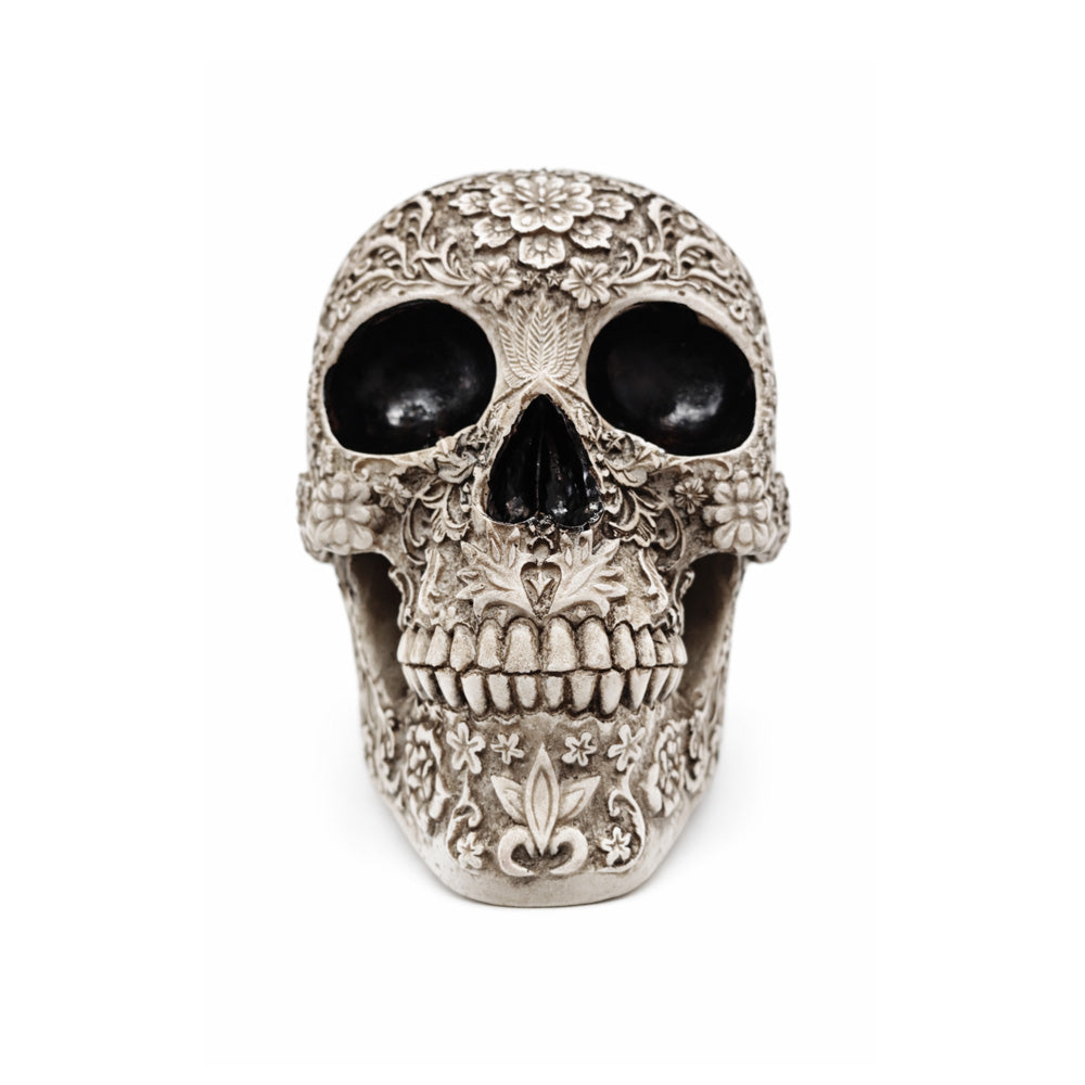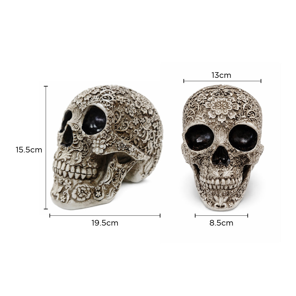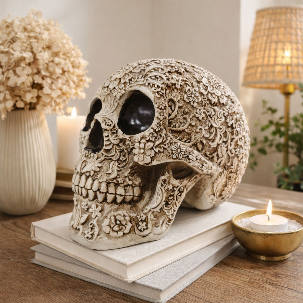 Made from solid resin, the skull feels substantial and durable, making it ideal for display on shelves, desks or mantelpieces. Perfect for those who love alternative décor, this decorative skull adds character, depth and visual interest to both seasonal and year-round interiors.
