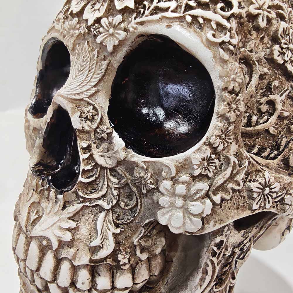 This plum blossom skull decoration is a beautifully detailed statement ornament that blends gothic style with delicate floral artistry. Crafted with intricate raised flower patterns across the entire skull surface, it features deep black eye sockets and a distressed bone-effect finish that creates a striking contrast between elegance and edge.