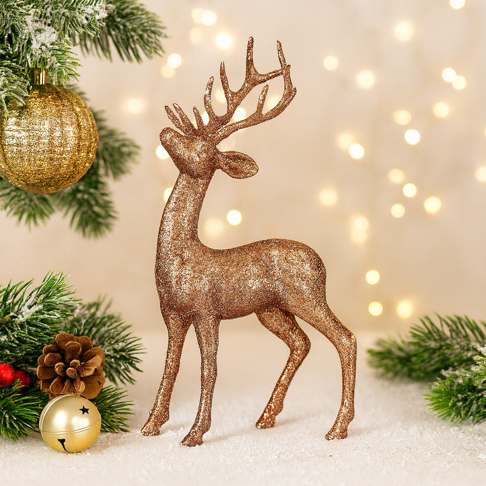 Create a great festive atmosphere event with our Rose Gold Glitter Standing Reindeer Ornament, it is perfect for Christmas family events. This item measures approximately 26cm and will make a great addition for holiday season party.