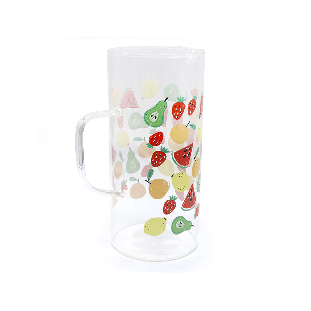 Serve beverages in style with the Fruit Printed Glass Water Jug. This charming jug features vibrant fruit designs that add a playful and decorative touch to any kitchen or dining setting. With a generous capacity, it is perfect for serving water, juice, iced tea, or other refreshing drinks to family and guests. Made from durable, high-quality glass, the jug is built to last and is easy to clean. Its wide opening ensures convenient filling and pouring, making it a practical and attractive addition to everyday meals, parties, or special occasions.