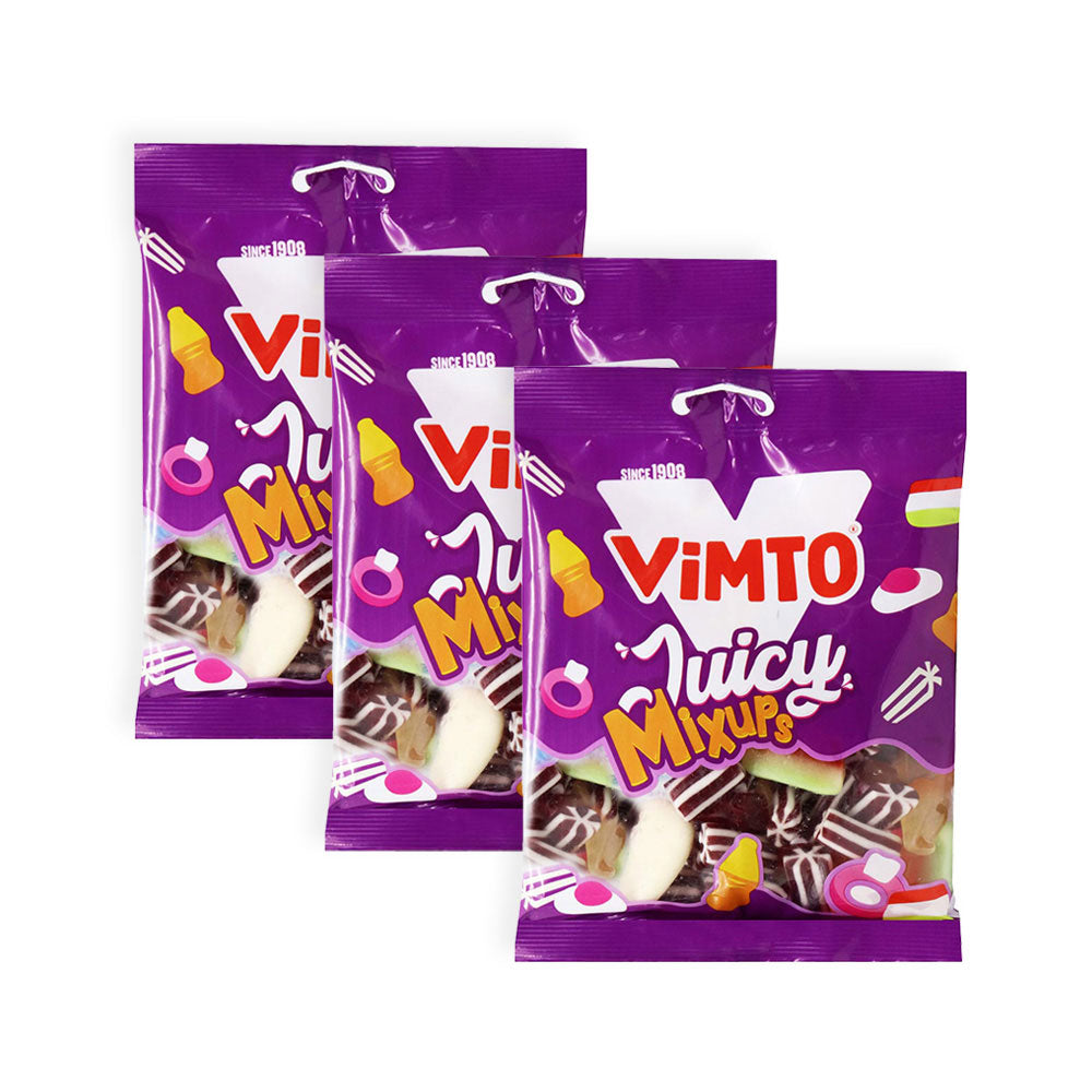 Vimto Juicy Mixups is a delicious assortment of tasty Vimto flavoured chewy sweets! These satisfyingly chewy British sweets are bursting with juicy Vimto flavours like Vimto Stix, Vimto Watermelon Slice, Vimto Mango Bottle, Vimto Yolky and Vimto Bling Ring.