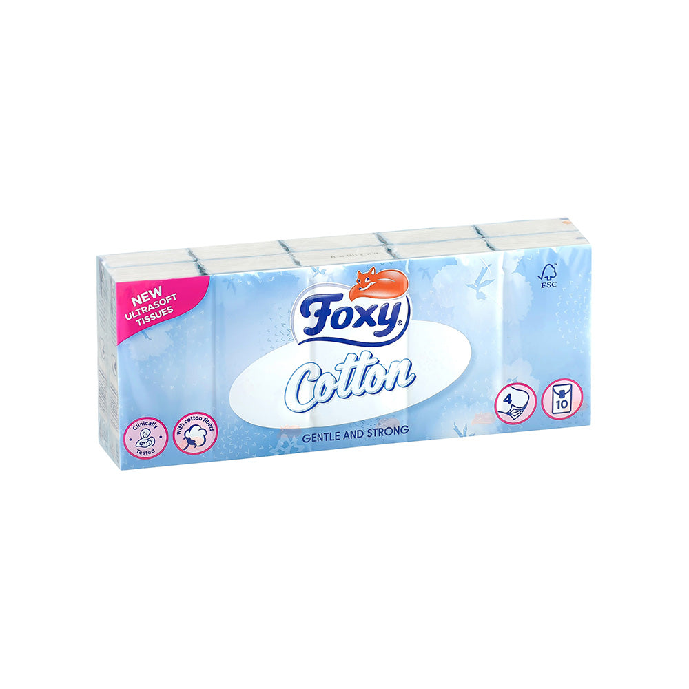 Stay prepared and comfortable with Foxy Cotton Pocket Tissues 4-Ply ¨C 10 Pack. These ultra-soft, four-layer tissues are designed to provide gentle, effective care for sensitive skin, while their compact pocket size makes them easy to carry wherever you go. Whether dealing with allergies, colds, or unexpected spills, these strong and absorbent tissues offer reliable performance in a convenient format. Perfect for daily use at work, school, or travel, Foxy pocket tissues combine premium softness with everyday practicality.